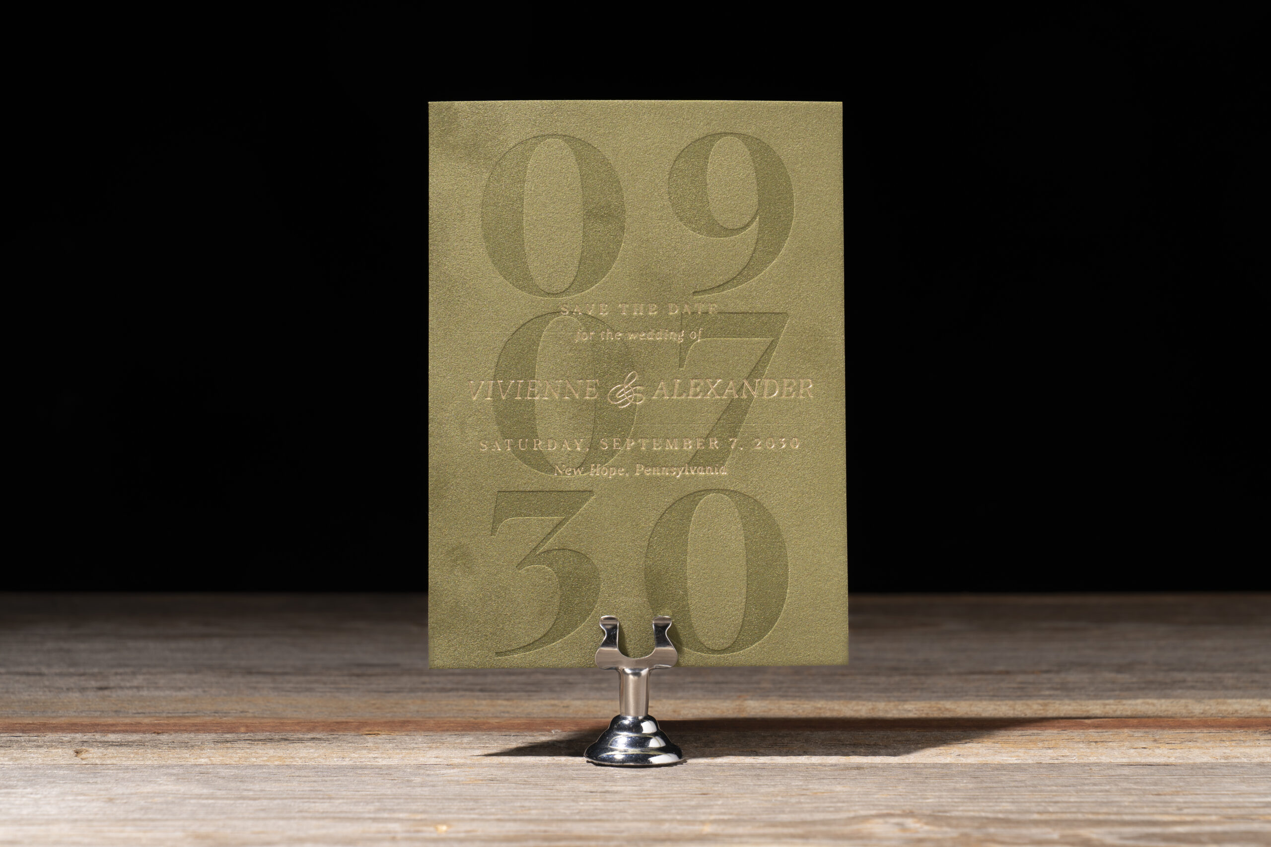 Save the Dates by Katie Magee for Bella Figuraletterpress ink: acadia | foil stamping: champagne matte | fonts: ecatherina + loretta display | paper: duplexed sage velvet + moss 1-ply | card size: a-6 (tier 2)