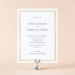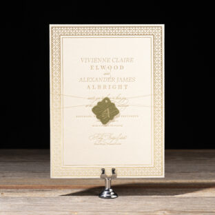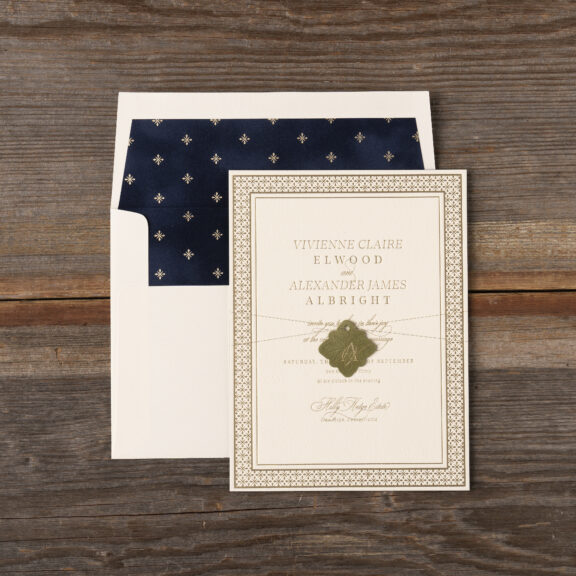 Wedding Invitations by Katie Magee for Bella Figuraletterpress ink: acadia | foil stamping: champagne matte | fonts: ecatherina + loretta display | paper: bella cotton ivory 2-ply + duplexed sage velvet + moss 1-ply (tag) | invitation size: f-8 (tier 3) | tag size: 1.5 x 1.5 (tier 1) | diecut style: bf-161 | edge painting: denim | metallic thread: tawny | foil stamped liner: albright pattern in champagne matte on navy velvet | envelope: bella cotton ivory | digital addressing: denim