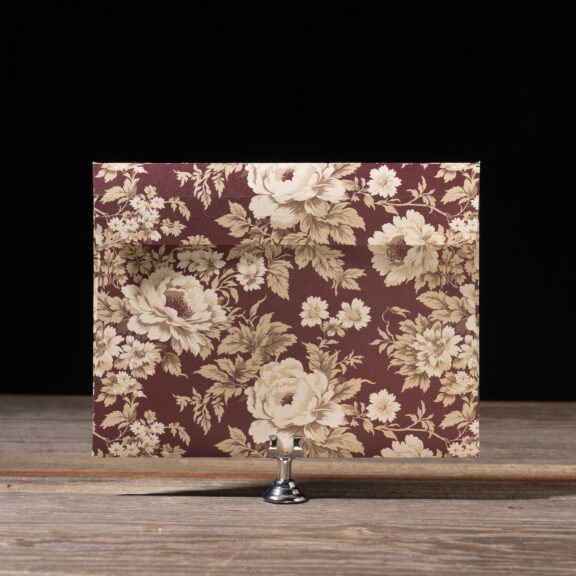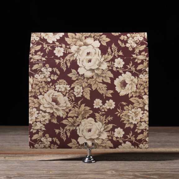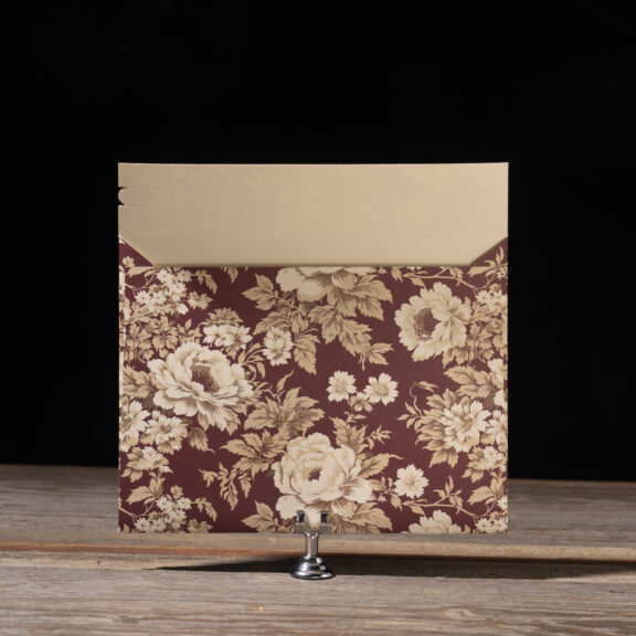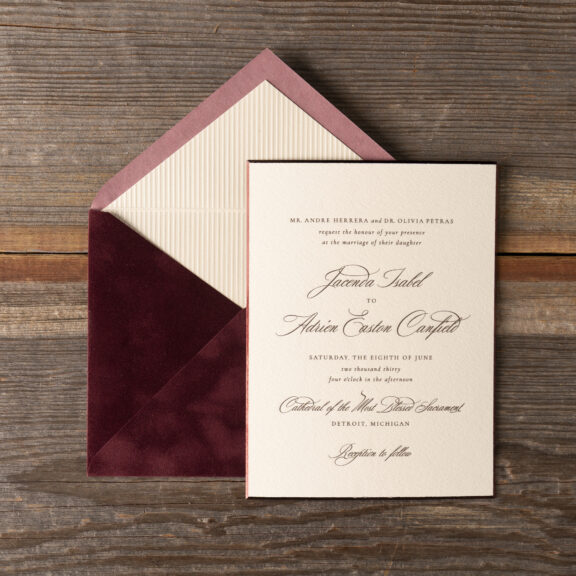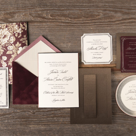 Wedding Invitations by Jessica Downs for Bella Figuraengraving: espresso | embossing: blind | fonts: cormorant + dalgond script | paper: cotton ivory 2-ply + metallic bronze 1-ply | invitation size: f-8 (tier 3) | mounting card size: custom cut 4.81 x 6.44 | back belly band size: custom cut 1.75 x 6.5 assembled | bevel: 45ยบ | foil edging: burgundy shine | embossed liner: blind in canfield stripe on metallic opal 1-ply | custom converted envelope: wine velvet | envelope printing: tawny shine | horizontal mailer: 9.38 x 7.16 assembled | diecut style: e-438 | mailer digital printing: canfield florals pattern in toffee + currant + camel + umber + antique gold