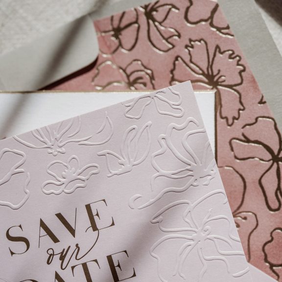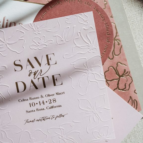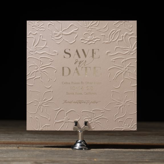 Save the Dates by Alix Hulihan for Bella Figurafoil stamping: mink matte | embossing: blind | fonts: sage + autumn melody | paper: metallic primrose 2-ply | card size: sq-6 (tier 2)