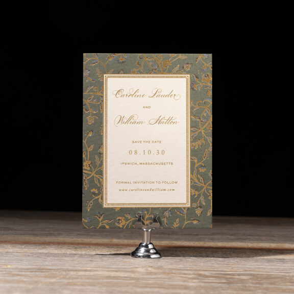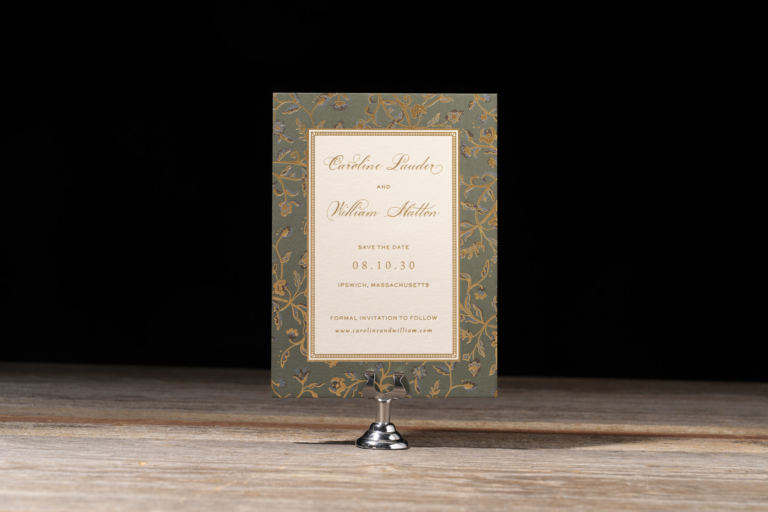 Save the Dates by Racheal Bumbolo for Bella Figurafoil stamping: gold matte | digital inks: deep blue + espresso + cypress | fonts: sweet sans + arno pro + diplomatic script | paper: bella smooth cotton ivory duplexed 2-ply | card size: a-6 (tier 2)