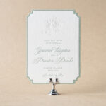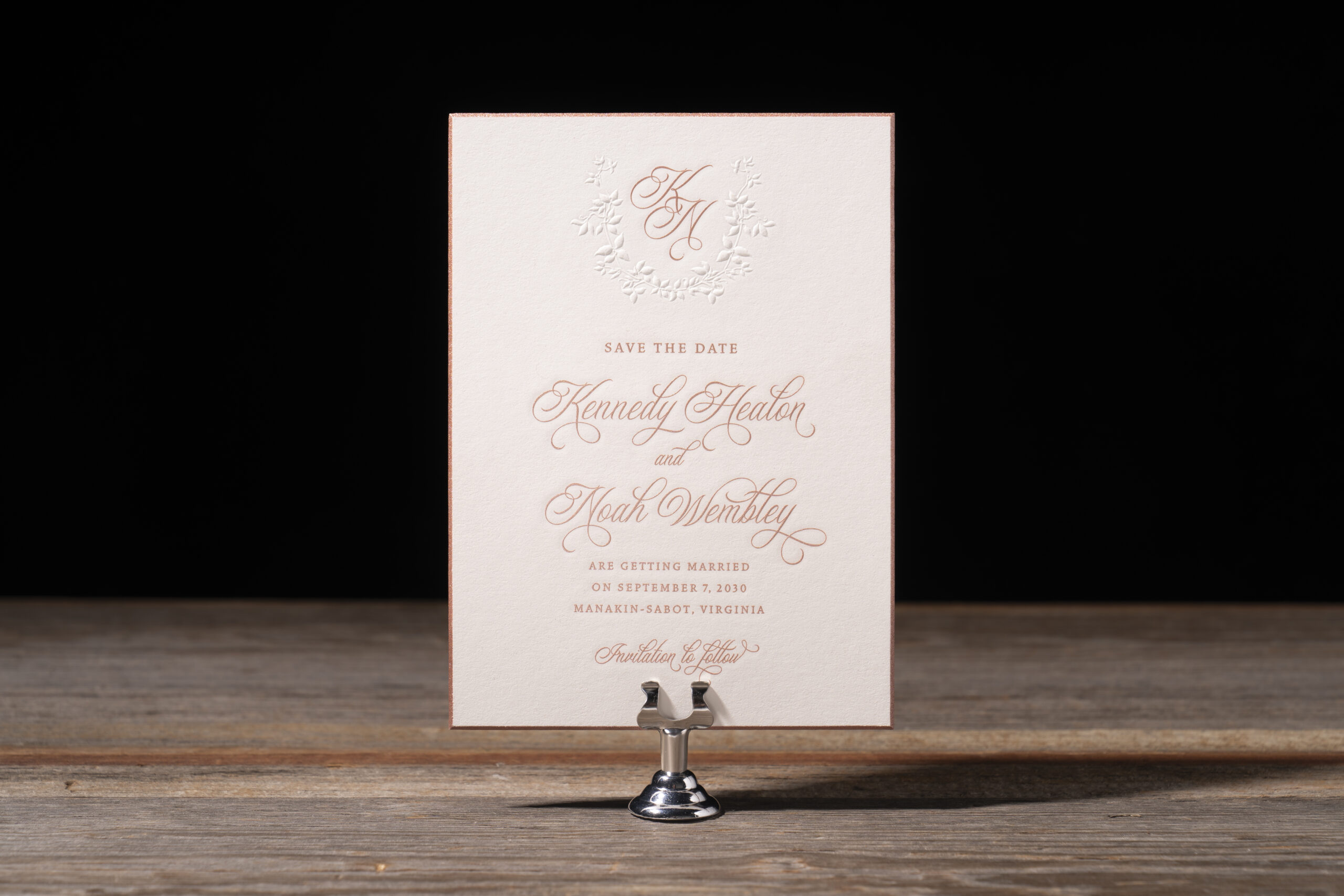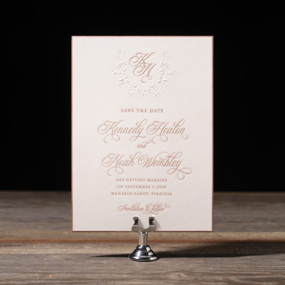 Save the Dates by Jessica Downs for Bella Figuraengraving: metallic rose gold | embossing: blind | fonts: vendetta + rhapsody script | paper: bella smooth cotton white 2-ply | card size: a-7 (tier 3) | bevel: 45ยบ | edge painting: metallic rose gold