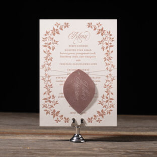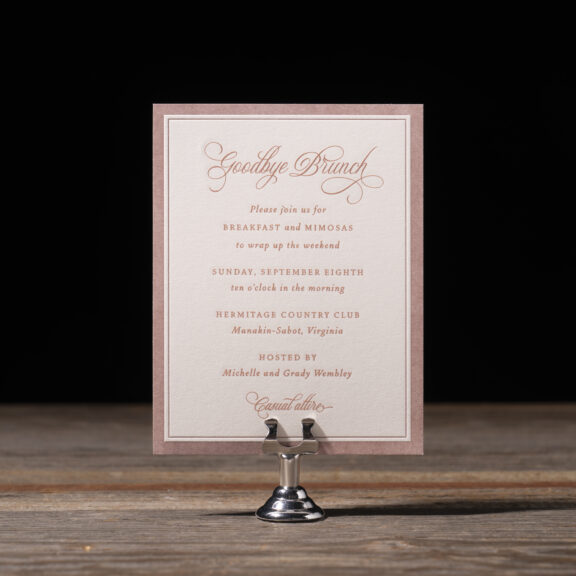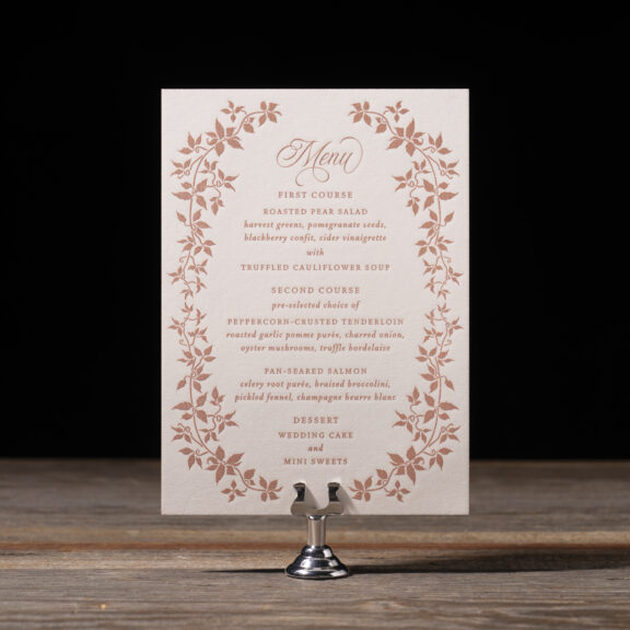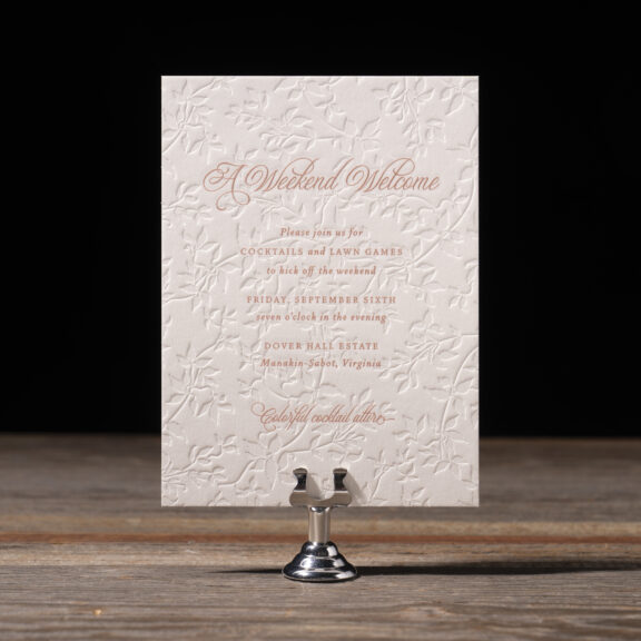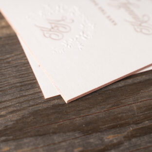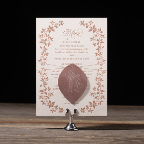 engraving: metallic rose gold | embossing: blind | fonts: vendetta + rhapsody script | paper: bella smooth cotton white 2-ply | card size: a-6 (tier 2)