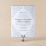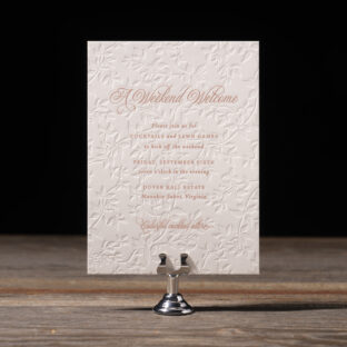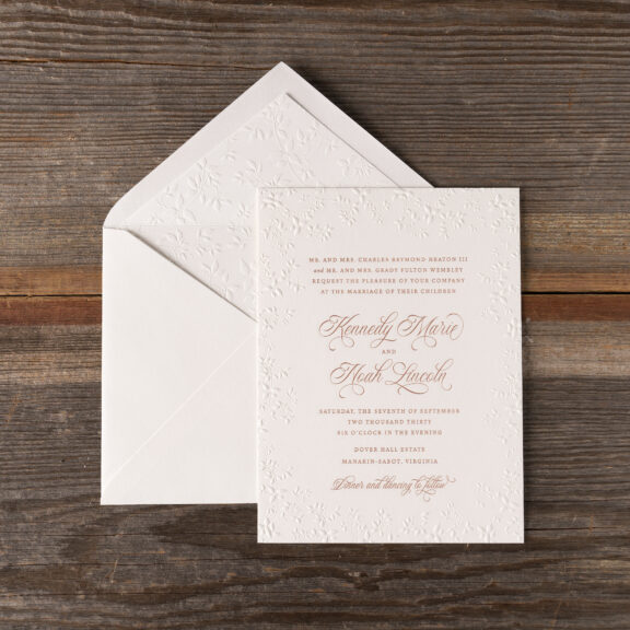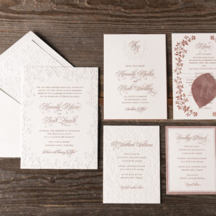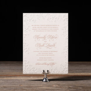 Wedding Invitations by Jessica Downs for Bella Figuraengraving: metallic rose gold | embossing: blind | fonts: vendetta + rhapsody script | paper: bella smooth cotton white 2-ply | card size: f-8 (tier 3) | embossed liner: blind in heaton pattern on bella cover | outer envelope: bella cotton white pointed flap | digital addressing: rosette