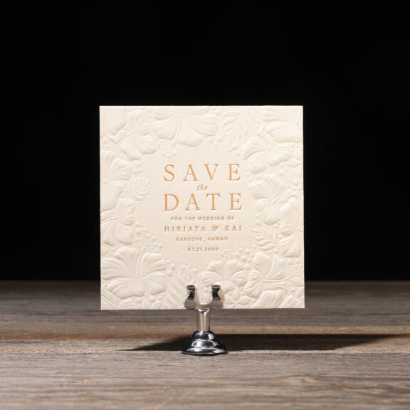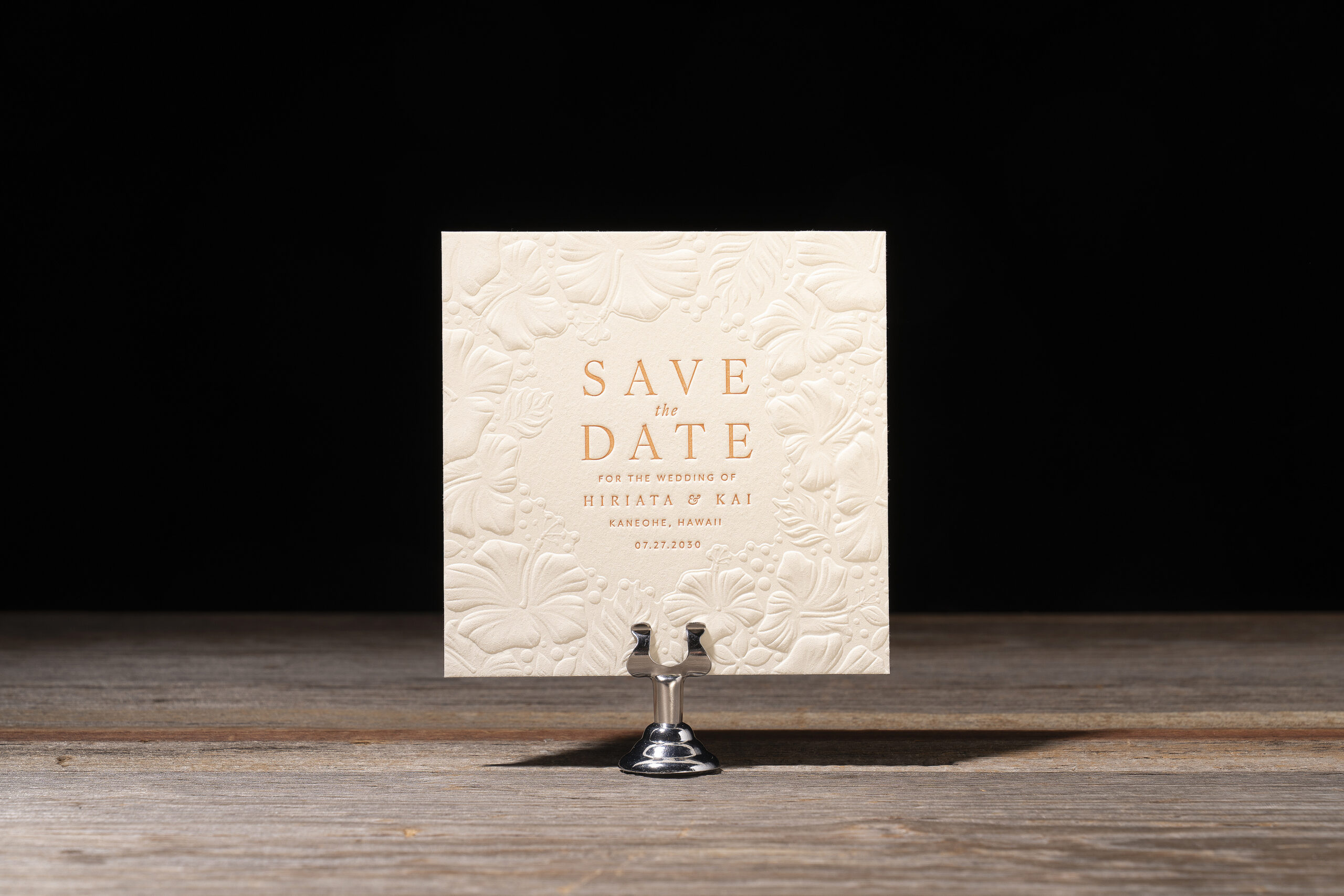Save the Dates by Michael Gafrancesco for Bella Figuraletterpress ink: persimmon | sculpted embossing: blind | fonts: ivyora display + mr eaves mod ot book | paper: bella cotton ivory 2-ply | card size: sq-5 (tier 1)