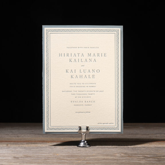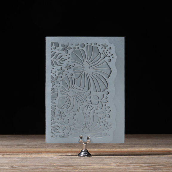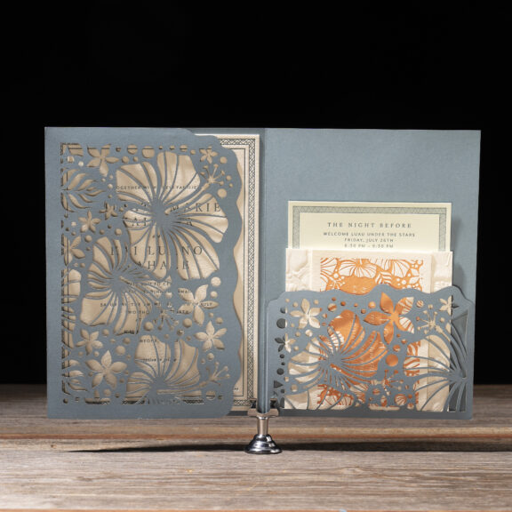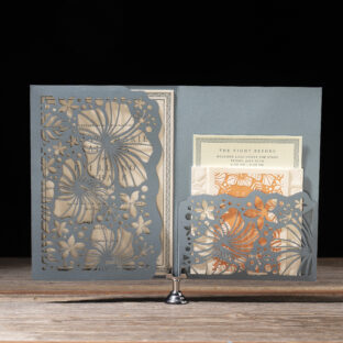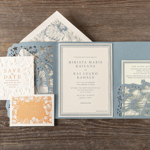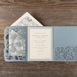 Wedding Invitations by Michael Gafrancesco for Bella Figuraletterpress ink: lagoon | fonts: ivyora display + mr eaves mod ot book | paper: bella cotton ivory 1-ply + lagoon 1-ply (pocketfold) | invitation size: f-8 for pocketfold (tier 3) | pocketfold: f-8 vertical pocketfold | laser cut style: cd-854 | digital liner: hiriata in lagoon | envelope: bella cotton ivory pointed flap | digital addressing: lagoon