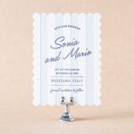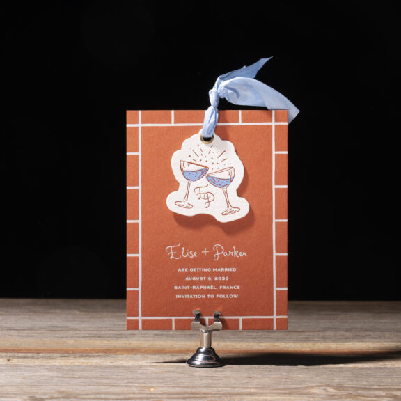 Save the Dates by Katie Magee for Bella Figuraletterpress ink: carolina | foil stamping: vermilion matte + white matte | fonts: gerald and margaret + cottage sans | paper: mesa 2-ply + bella cotton white 1-ply (tag) | card size: a-6 (tier 2) | tag size: 2.34 x 2.67 (tier 1) | diecut style: bf-163 | silk ribbon: cerulean | hole drill: .25" | grommet: gold