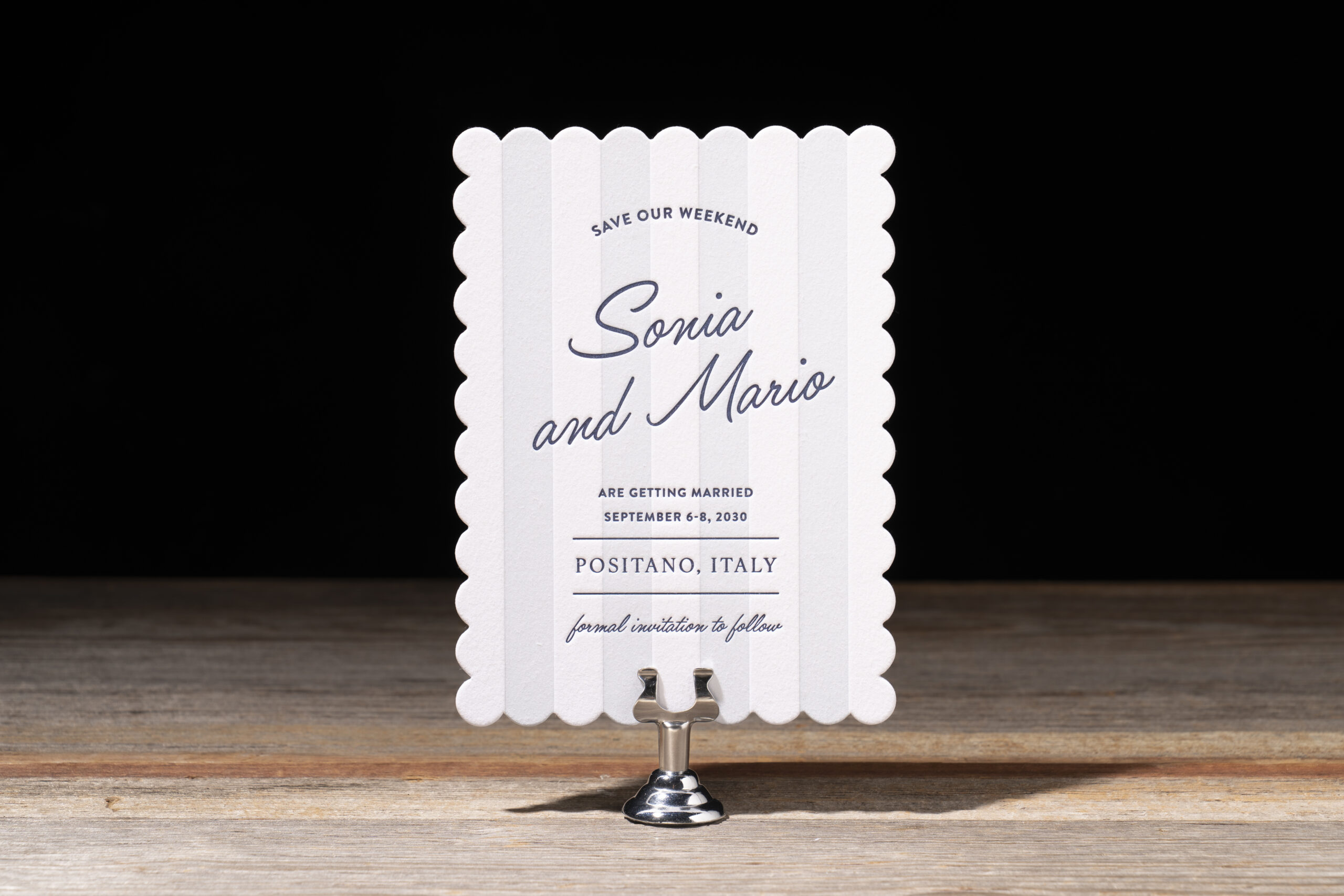 Save the Dates by Racheal Bumbolo for Bella Figuraletterpress inks: powder blue + navy | fonts: brandon grotesque + ivy ora display + filmotype lacrosse | paper: bella cotton bright white 2-ply | card size: a-6 (tier 2) | diecut style: bf-95