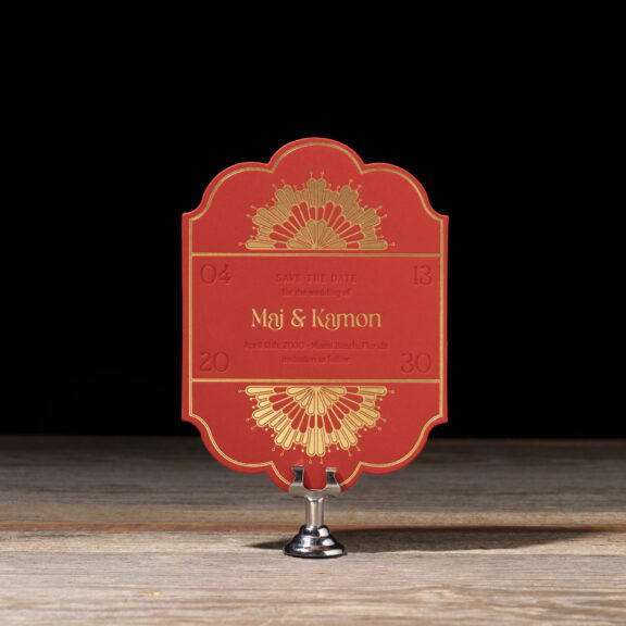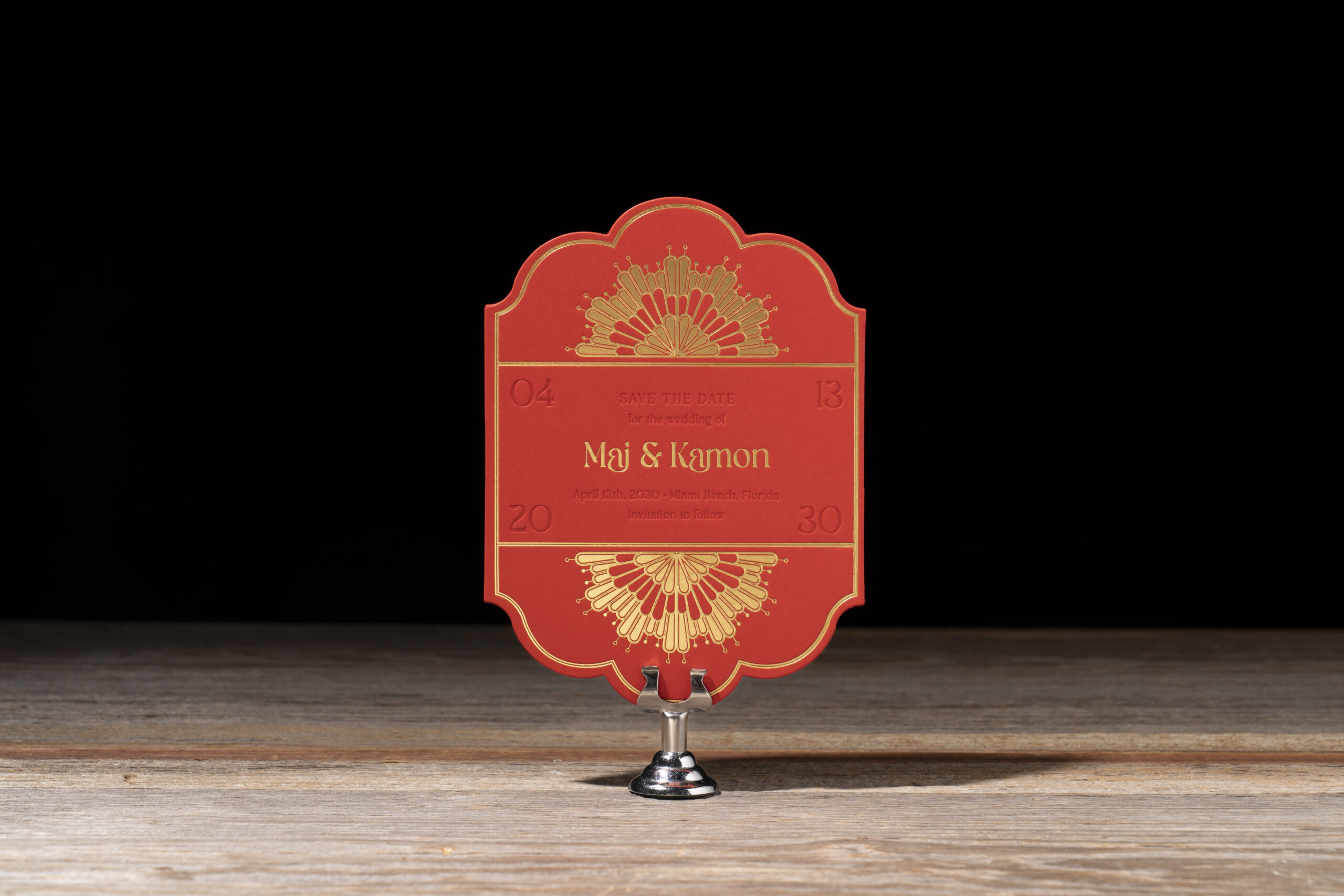 Save the Dates by Alyssa Tidd for Bella Figuraletterpress ink: chili | foil stamping: gold matte | font: bailey | paper: chili 2-ply | card size: a-6 (tier 2) | diecut style: bf-182