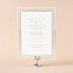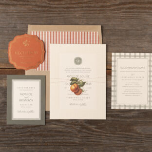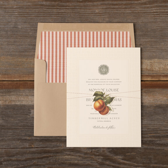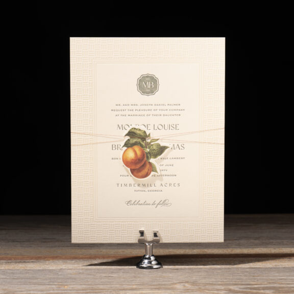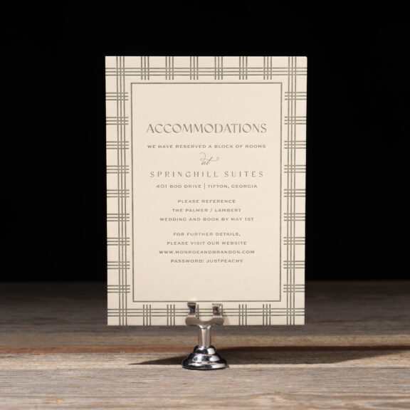 Wedding Invitations by Lindsy Talarico for Bella Figuraletterpress inks: sand + cypress | digital inks: cmyk | fonts: sweet gothic regular + classico bold + diplomatic script | paper: bella smooth cotton ivory 2-ply + bella smotth cotton ivory 1-ply (tag) | invitation size: f-8 (tier 3) | tag size: 2 x 2.05 (tier 1) | diecut style: bf-169 | metallic thread: copper | digital liner: furrow pattern in mesa | envelope: latte | digital addressing: cypress