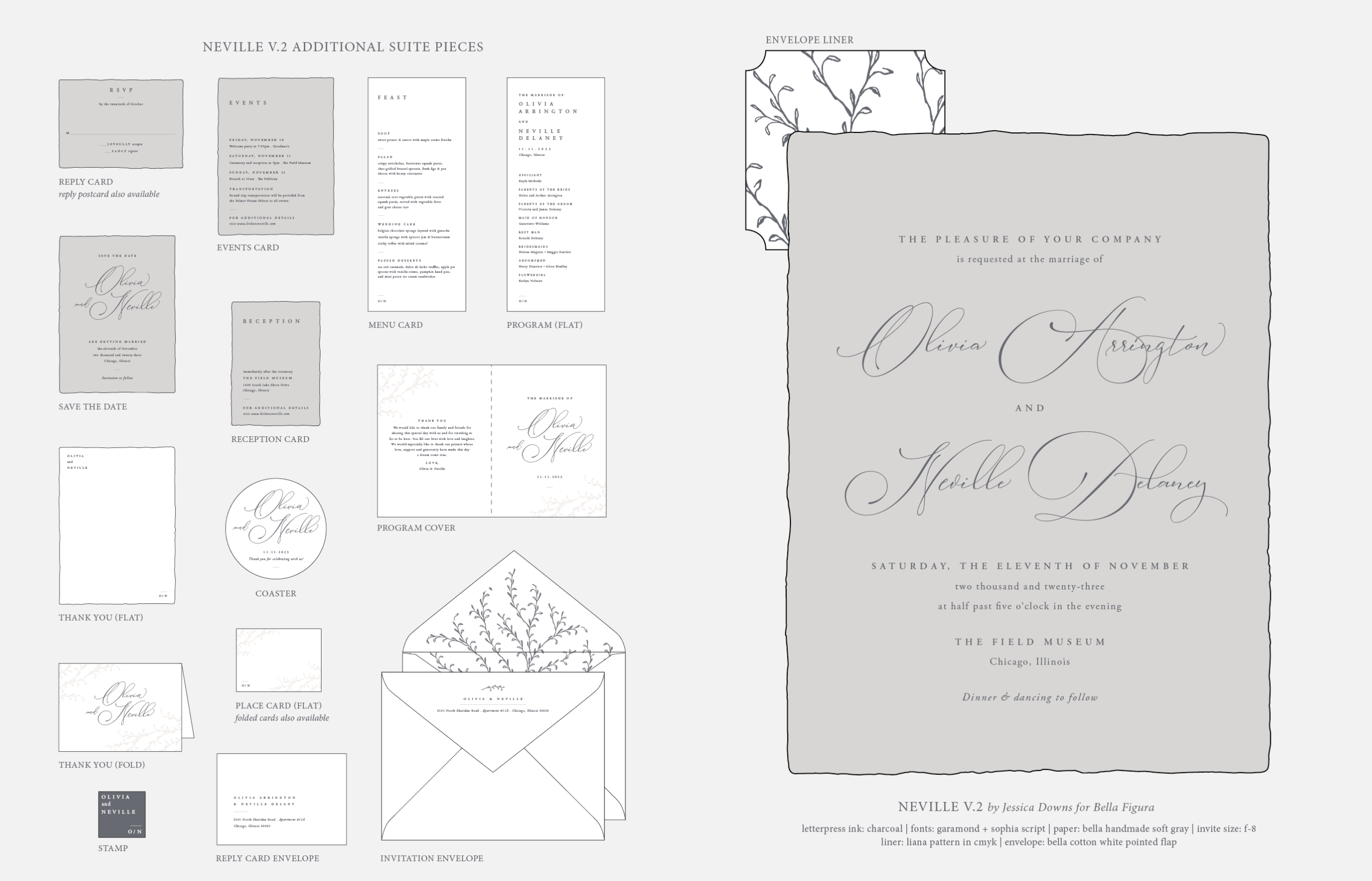 Retired Designs by Jessica Downs for Bella Figuraletterpress ink: charcoal | fonts: garamond + sophia script | paper: bella handmade soft gray | invite size: f-8 | liner: liana pattern in charcoal | envelope: bella cotton white pointed flap