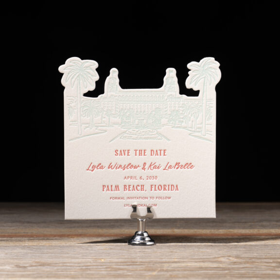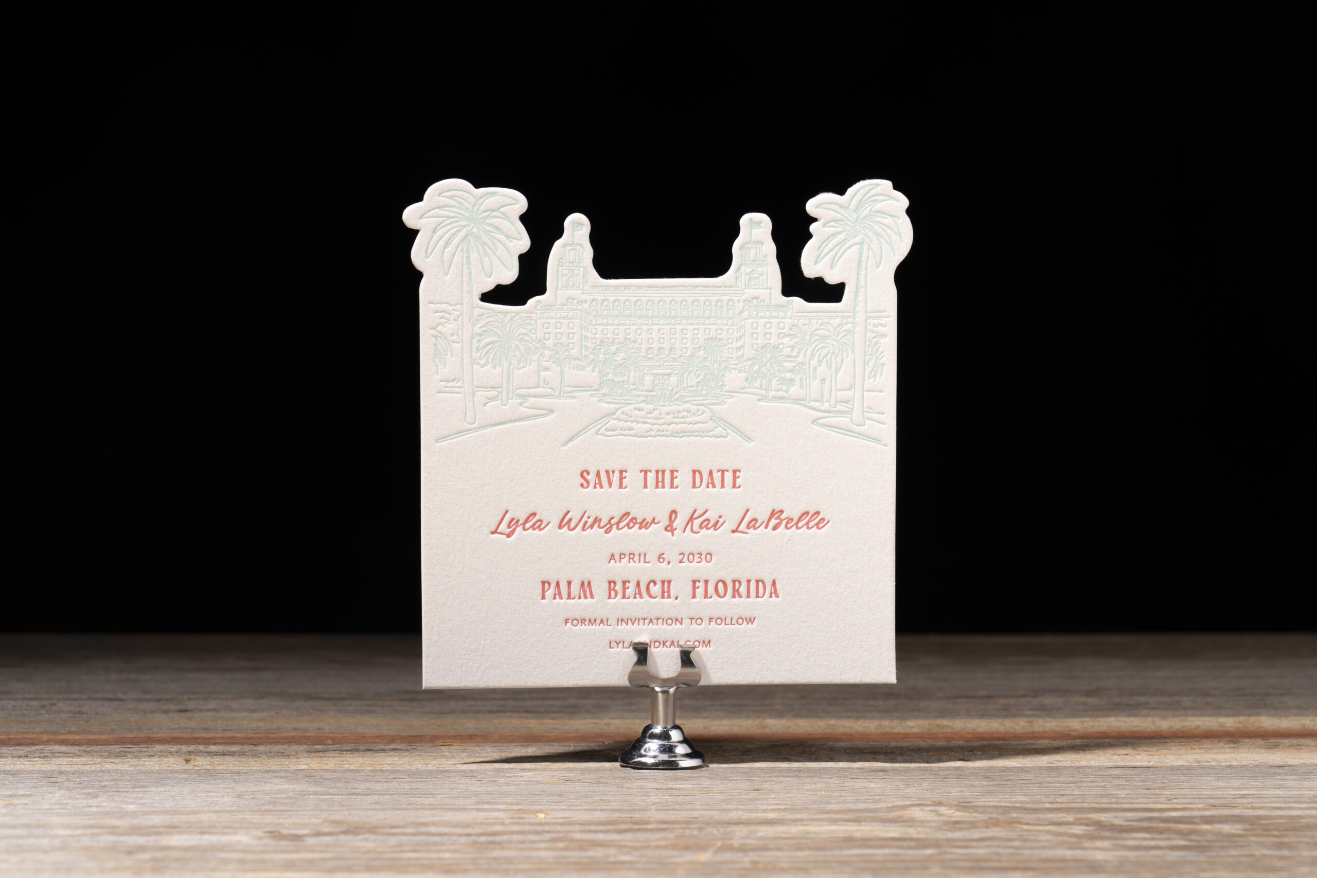 Save the Dates by Meghan O'Brien for Bella Figuraletterpress inks: watermelon + atlantis | fonts: makawao + karol sans + danforth | paper: bella cotton white 2-ply | card size: 6.19 x 6.19 (tier 2) | diecut style: bf-173