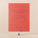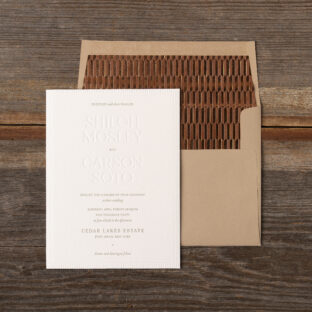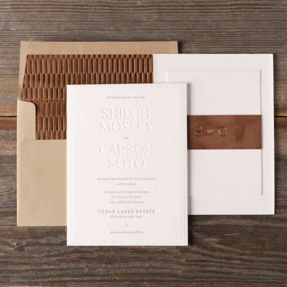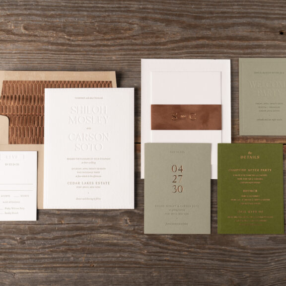 Wedding Invitations by Racheal Bumbolo for Bella Figuraletterpress inks: spruce + blind deboss | foil stamping: copper shine | fonts: century gothic + adobe jenson + branch | paper: bella cotton 2-ply + 1-ply (mounting card) + mocha velvet (belly band) | invitation size: f-8 (tier 3) | mounting card size: 6.44 x 4.81 (tier 2) | belly band size: 4.85 x 1.75 assembled | foil stamped liner: pennington pattern in copper shine on mocha velvet | envelope: latte | digital addressing: hunter