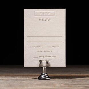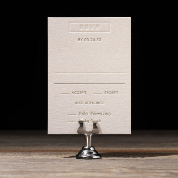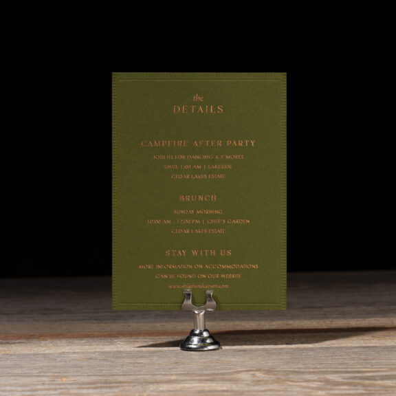 letterpress inks: spruce + blind deboss (no ink) | fonts: century gothic + adobe jenson + branch | paper: spruce 2-ply | card size: a-2 (tier 1) | foil edging: copper shine