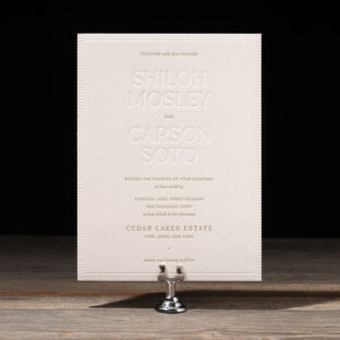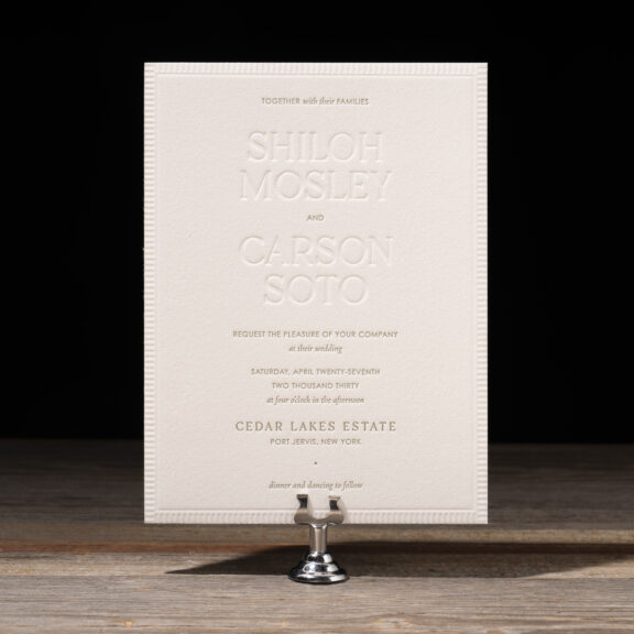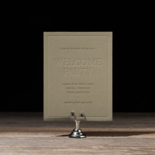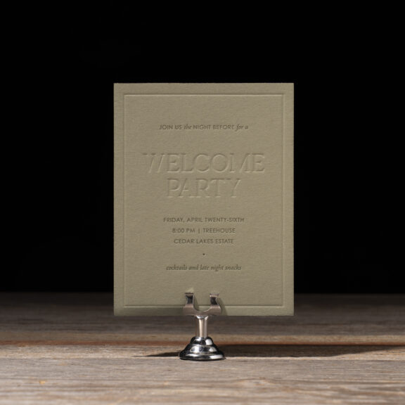 letterpress ink: blind deboss (no ink) | foil stamping: copper shine | fonts: century gothic + adobe jenson + branch | paper: moss 1-ply | card size: a-6 (tier 2)