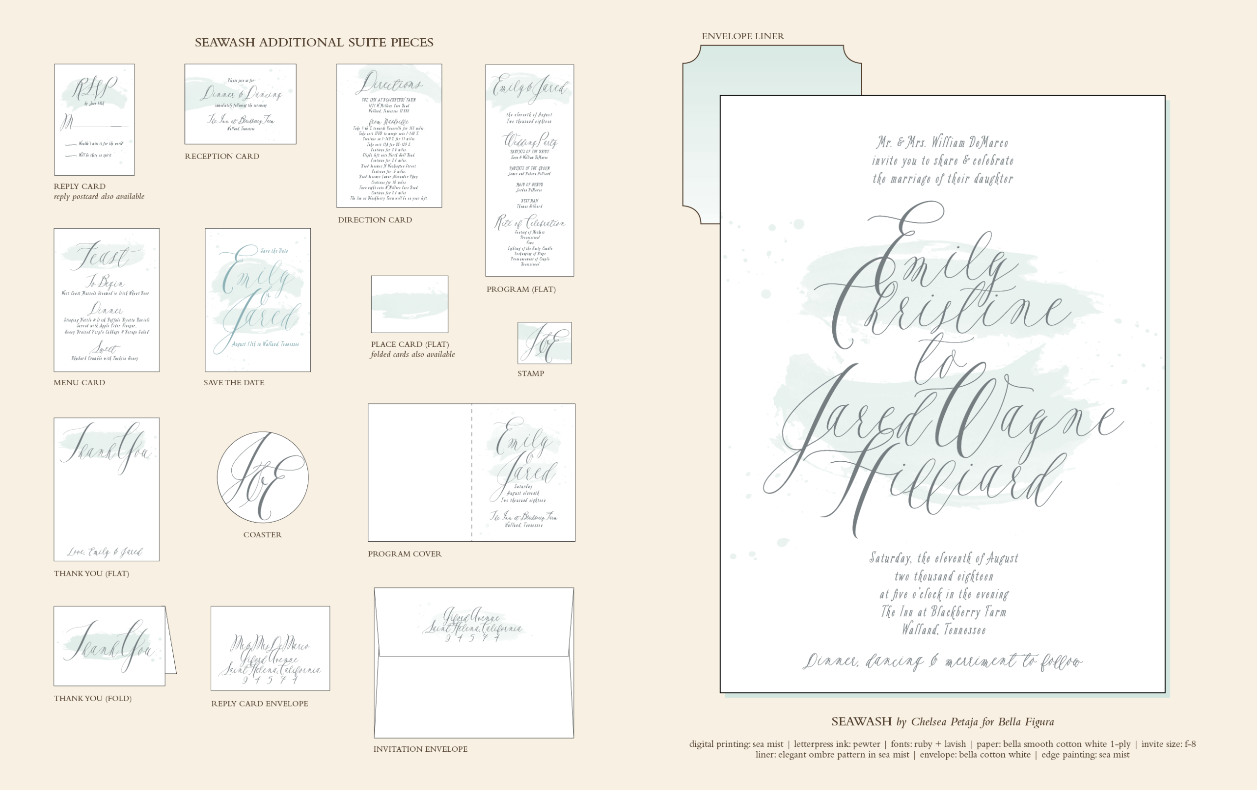 Wedding Invitations by Chelsea Petaja for Bella FiguraA sea glass inspired palette and whimsical fonts add an airy, beachy feel to Chelsea Petaja's Sea Wash wedding invitations. Soft watercolor inspired design elements are digitally printed in Sea Mist while Pewter letterpress ink emphasizes the bold, whimsical fonts.