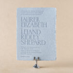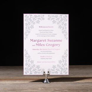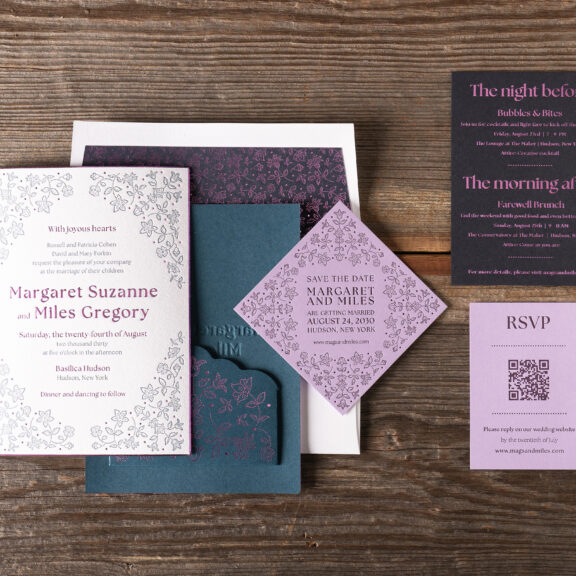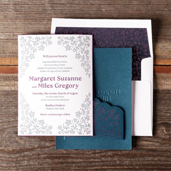 Wedding Invitations by Jessica Salisbury for Bella Figuraletterpress ink: amazon | foil stamping: plum shine | foil embossing: plum shine | font: the seasons | paper: cotton bright white 1-ply + duplexed amazon 1-ply | invitation size: f-8 (tier 3) | back pocket size: 4.83 x 3.45 | diecut style: ps-556 | bevel: 45ยบ | foil edging: plum shine | foil stamped liner: suzy pattern in plum shine on dark blue text | envelope: bella cotton bright white | digital addressing: amazon