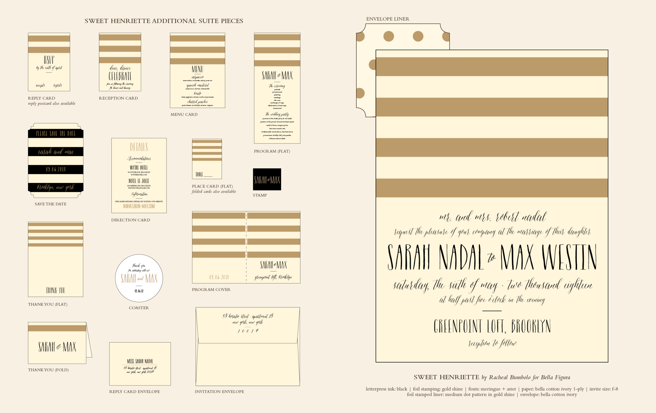 Wedding Invitations by Racheal Bumbolo for Bella FiguraEver the life of the party, Sweet Henriette wedding invitations are fashionable, fun and playful. Festive Gold Shine foil stamped envelope liners in our modern dot pattern complement the design's bold, foil stamped stripes, while Black letterpress ink keeps the invitation sophisticated and chic.