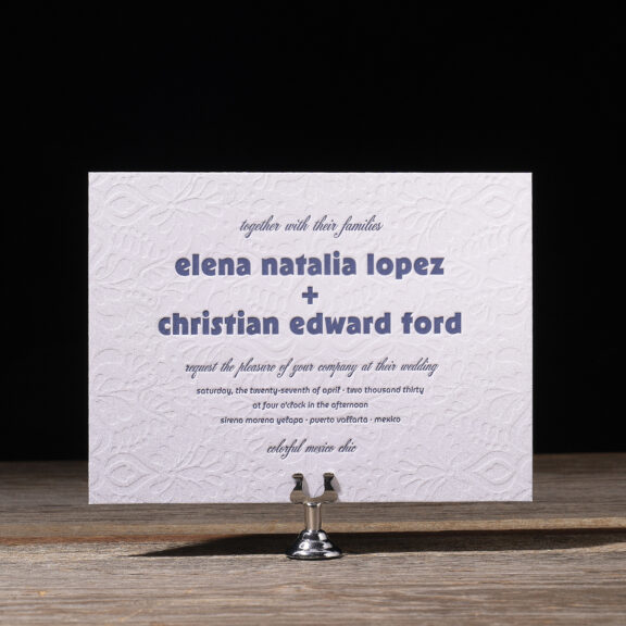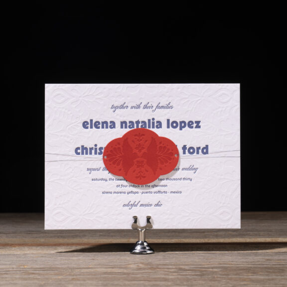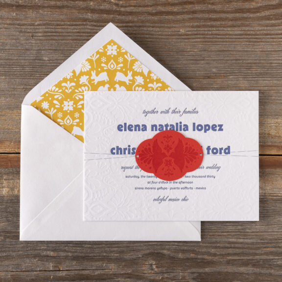 Wedding Invitations by Leslie Johnston for Bella Figuraletterpress inks: royal blue + blind deboss (no ink) + chili | fonts: acroterion jf + rl aqva black + museo moderno medium italic | paper: bella smooth cotton bright white 2-ply + chili 1-ply (tag) | invitation size: f-8 (tier 3) | tag size: 3.25 x 2.42 (tier 1) | diecut style: bf-186 | metallic thread: slate | envelope: bella cotton bright white | digital liner: talavera pattern in goldenrod | digital addressing: royal blue