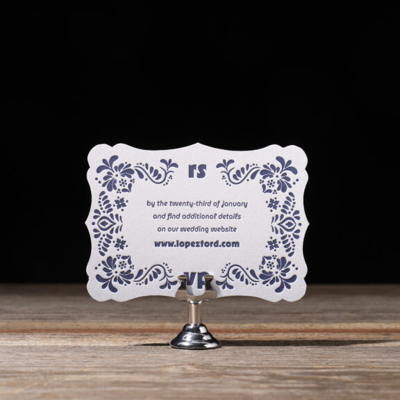 letterpress ink: royal blue | fonts: acroterion jf + rl aqva black + museo moderno medium italic | paper: sky 1-ply | card size: 4.88 x 3.5 (tier 1) | diecut cut style: bf-2