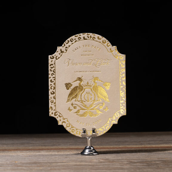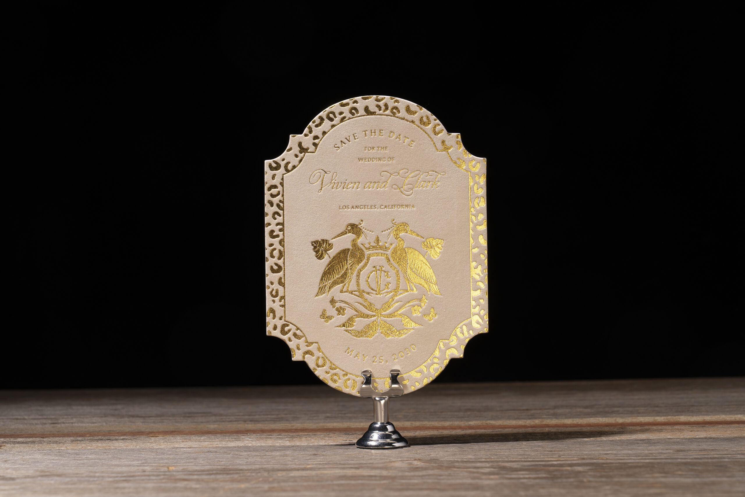 Save the Dates by Leslie Johnston for Bella Figurafoil stamping: gold shine | fonts: dulcinea + mestiza + totf monogram | paper: duplexed linen velvet + lagoon 2-ply | card size: 6.19 x 4.56 (tier 2) | diecut style: bf-185
