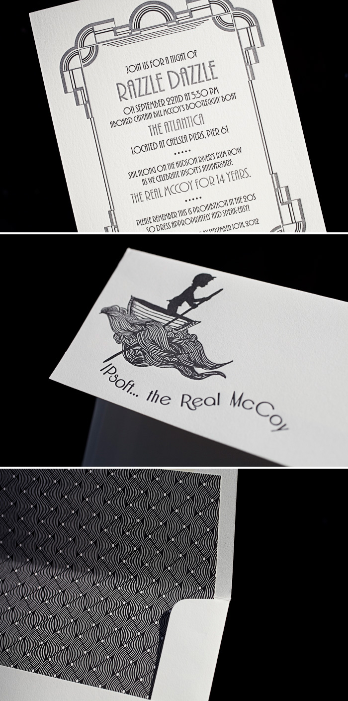 Corporate shindigs are one of the top non-wedding uses for our letterpress invites, and here’s a really cool one we did recently based on Elizabeth and David Mandel‘s Deco design. Lion in the Sun sent this really sweet printing gig our way, along with some custom artwork that we printed on the envelope flaps to coordinate with the set. Overall it’s a beautiful invite that goes along perfectly with the 1920’s theme of the event.