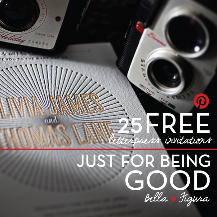 Judging: The team at Bella Figura will choose the top 5 do-gooders and will post them to a finalists board on Pinterest by Wednesday, April 4. Everyone is encouraged to read about the five finalists on the Bella Figura blog from April 4 through April 11, and should “like” their favorite on Pinterest in order to cast a vote. The do-gooder with the most likes on Thursday, April 12 will win the set of 100 free invitations. You must have a Pinterest account in order to “like” one of the finalists, so if you need an invitation, email dogood@bellafigura.com and we’ll send you an invite right away.