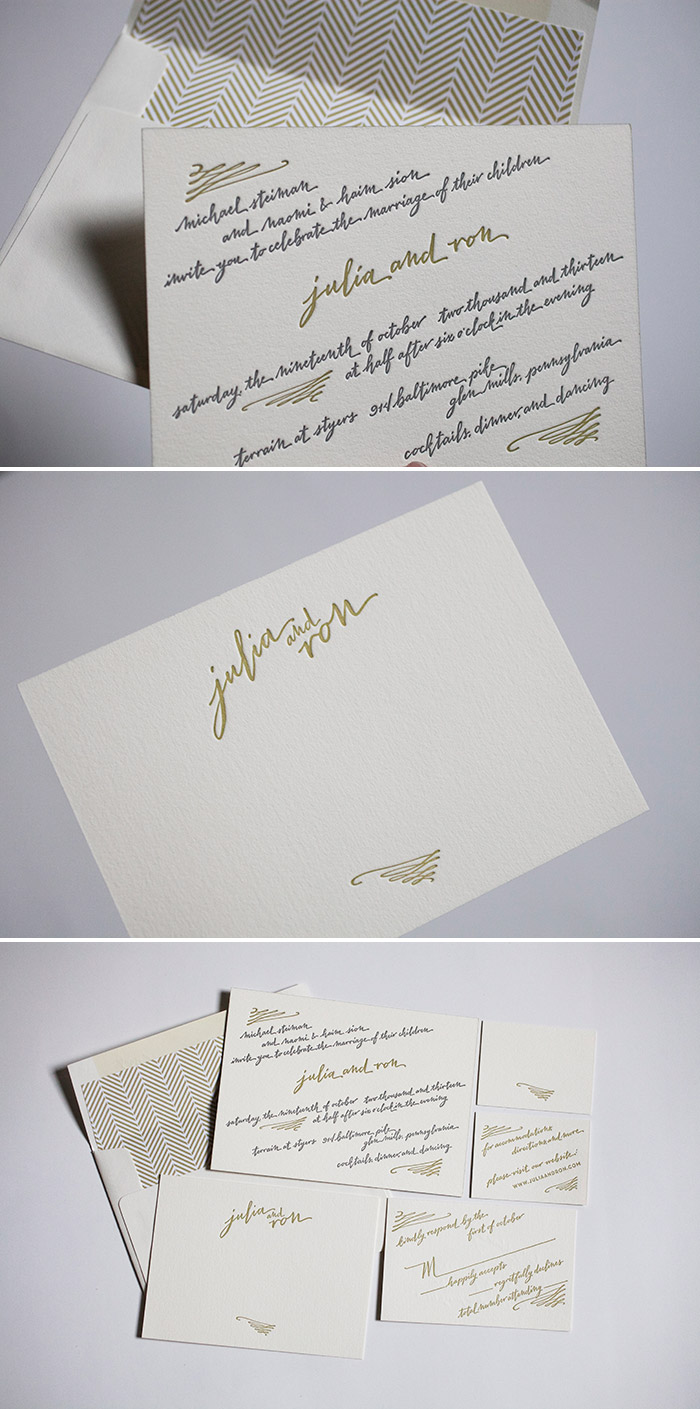Letterpress inks: hazel + pewter | paper: bella cotton 1-ply + 2-ply ivory | edge painting: hazel | hand calligraphy: mitty style | envelope: bella cotton ivory | envelope liner: modern herringbone pattern in hazel | customization #: 19999 | Papery of Philadelphia