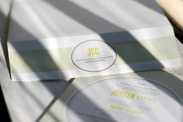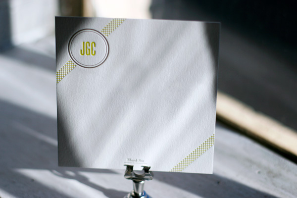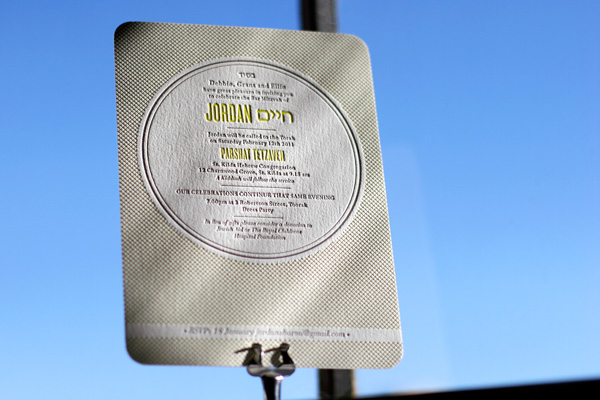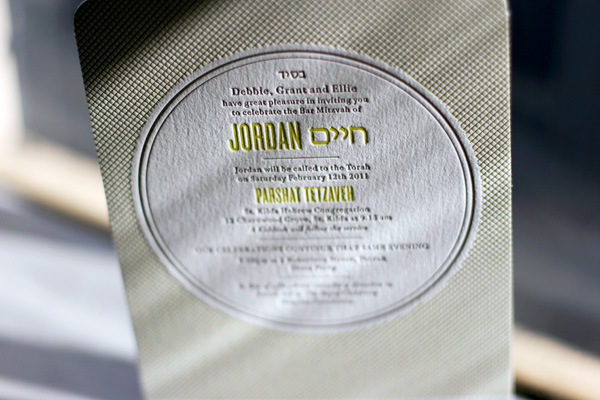 Printed in cool taupe and yarrow inks, we love this customization of our Harper letterpress invitations. Created for a super cool bar mitzvah, the set features Hebrew text and fun flat panel letterpress thank you notes.