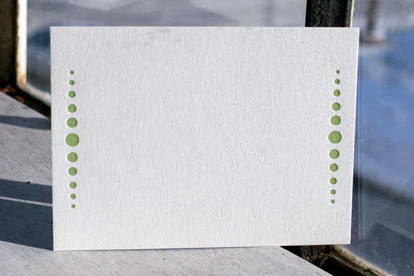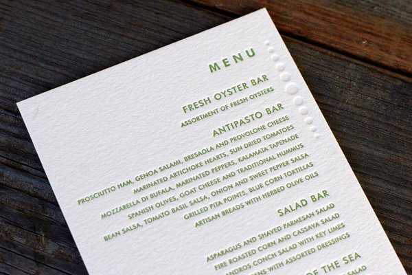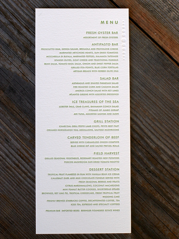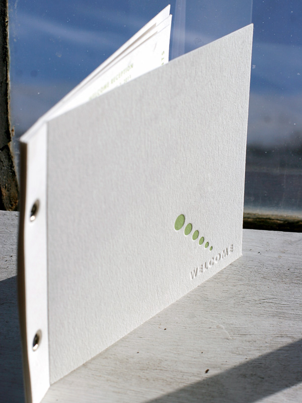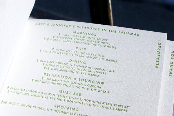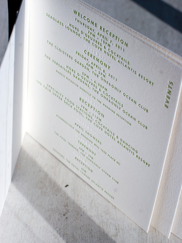To coordinate with their booklet letterpress invitations, we worked with Jennifer and Aret to create special letterpress pieces for their wedding weekend. A welcome booklet detailed weekend events and details and we also printed tea length letterpress dinner menus and table number cards. Oversized letterpress thank you cards (which will later hold a wedding photo) were the perfect finishing touch. Everything was printed in clover and blind deboss on our white cotton paper for a chic and completely sophisticated look.