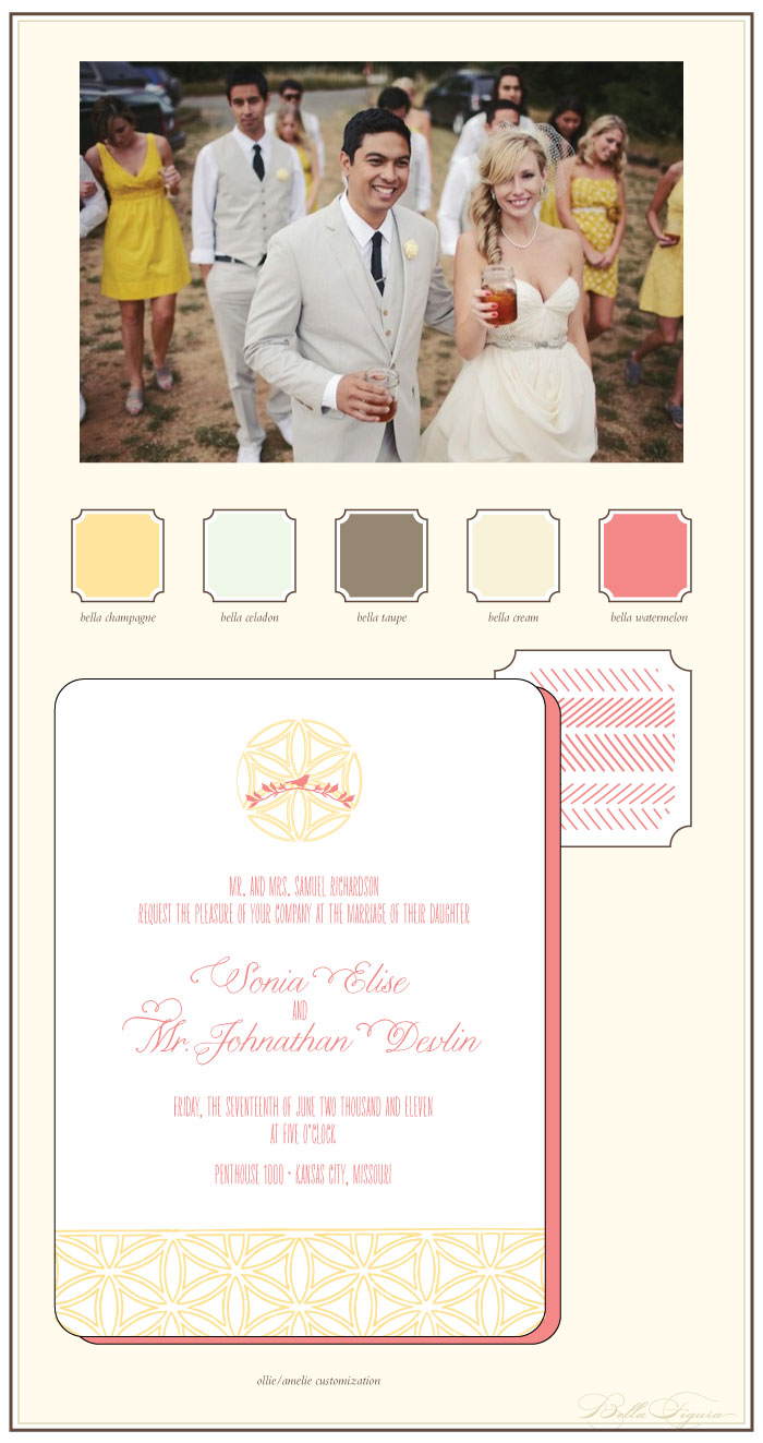 Mix and match! This custom letterpress wedding invite shares design elements from two different invitations- the Ollie pattern in champagne and the Amelie bird motif in watermelon. Get inspired and create your very own personalized invitations!