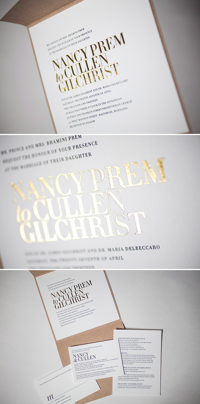 letterpress inks: antique gold + prussian blue | foil stamping: gold shine | fonts: aurora + poetica | paper: bella cotton white 1-ply | customization #: 16380