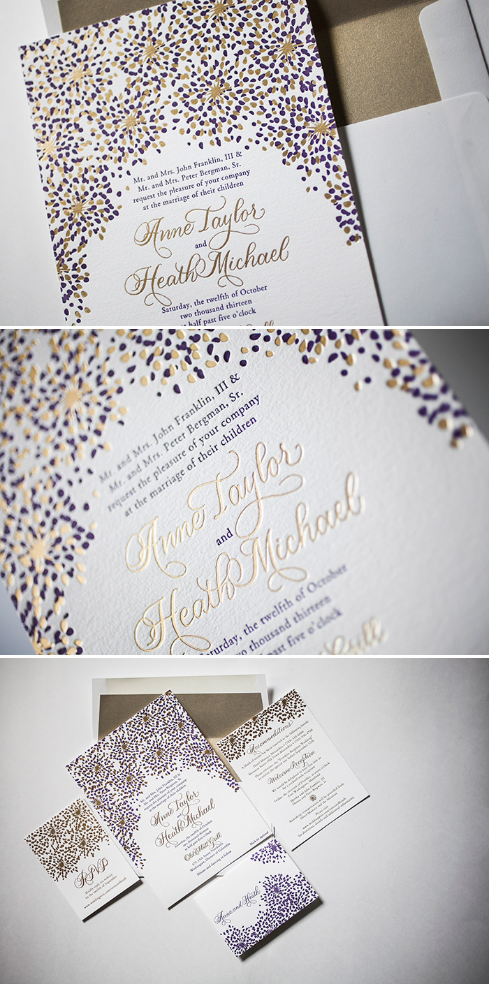 letterpress ink: regalia | foil stamping: gold matte | font: garamond | paper: bella cotton 1-ply white | hand calligraphy: copperplate style | envelope: bella cotton white | metallic liner: gold leaf | customization #: 19626 | Dandelion Patch