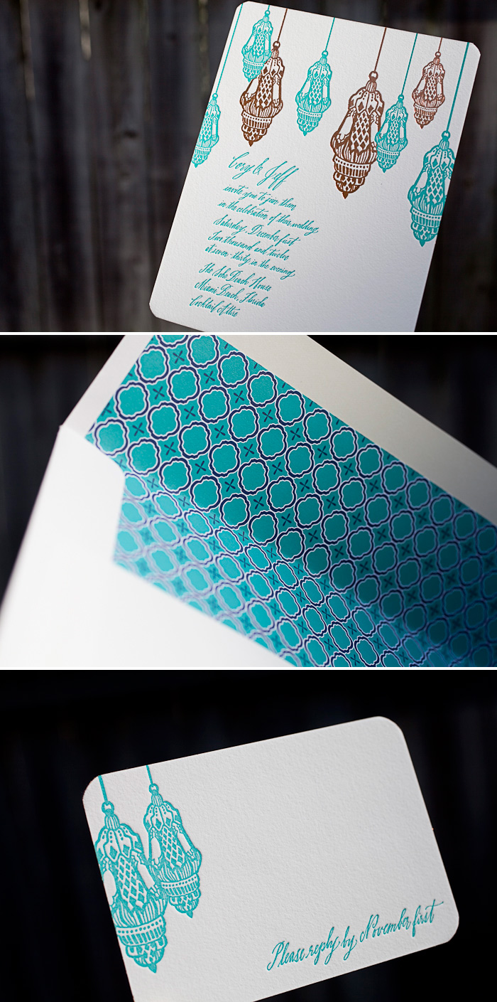 Papery and Cakery gets the credit for this awesome customization of Moroccan Romantic by Lindsy Aragona, and we really love the vivid color combination of the aquamarine letterpress ink and the copper foil stamping. It’s a gorgeous color choice for this design, and almost gives the impression of copper with and without it’s natural patina. The refined mosaic pattern used for the envelope liner also carries on the Moroccan inspiration beautifully.