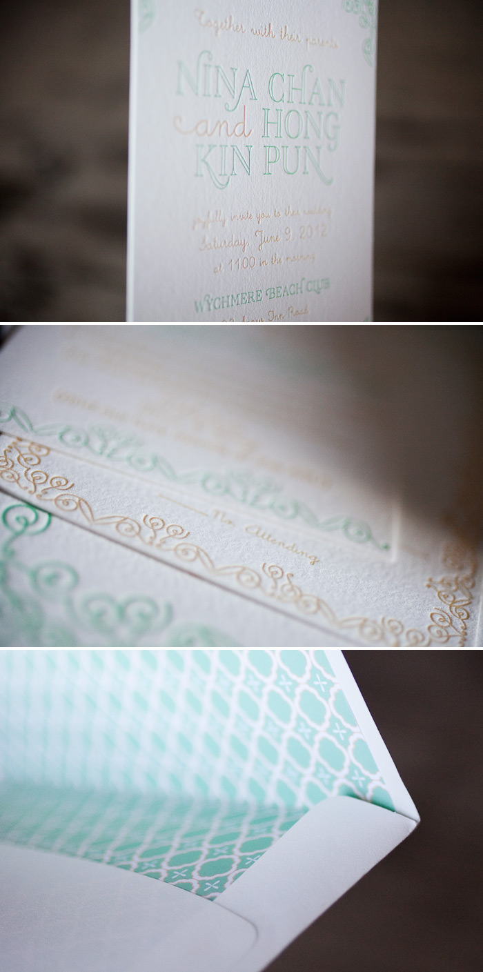 We love it when our brides customize our letterpress wedding invitation designs and we were thrilled when this bride submitted her own custom fonts! Our Deco design (by Elizabeth and David Mandel) looks totally retro in this timeless pairing of amethyst and chartreuse letterpress inks.
