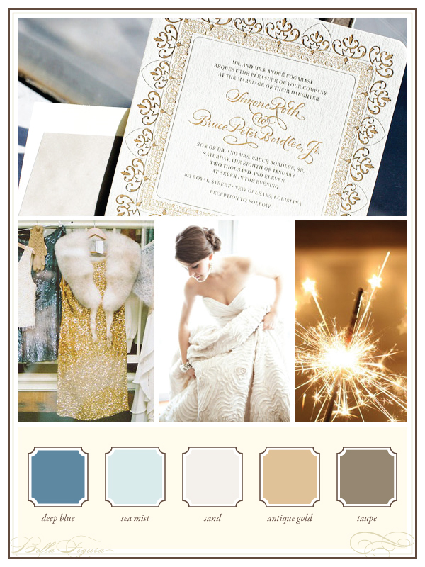 Today we’re wishing you a very happy new year with a little glamor inspired by our Claddagh letterpress wedding invitation in shades of deep blue, sea mist, sand, antique gold and taupe for a sophisticated and trés chic wedding soirée. We wish you a fabulous holiday weekend – see you in 2011! (Photo credits: wedding invitations + sequined dress + wedding gown + sparklers.)