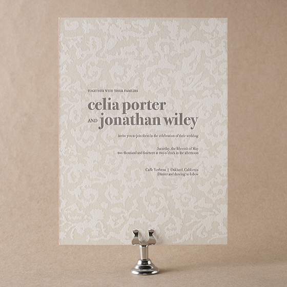 New from our 2011 collection, Hoxton is modern and industrial when paired with a neutral color palette of charcoal, pewter, pale gray and taupe combined with pops of geranium for a chic and sophisticated urban wedding. (Photo credits – letterpress invitations + love + dress + couch.)