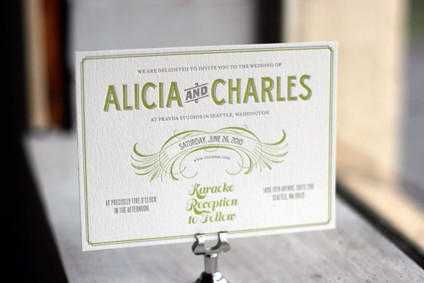 This spring-inspired customization of our Tara letterpress wedding invitation design was printed in chartreuse and downy inks. We love the pairing of cool vintage typography with fresh chartreuse as the starring color.