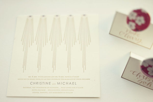 This gorgeous real wedding, first featured on Style Me Pretty, features an absolutely beautiful Bella Figura couple and a stunning Philadelphia wedding at Hotel Palomar. Christine and Michael chose our Bejeweled letterpress invitations, printed in antique gold and amethyst inks, to kick off their celebration. From there, all the details were impossibly elegant with a dash of modern glamor. Bella Figura calligrapher Patricia Mumau of Primele penned gorgeous place cards and calligraphy menus and the incredible Jesse and Whit of Our Labor of Love took some of the most gorgeous wedding photos we’ve ever seen. Much love and best wishes to you both, Christine and Michael, and thank you for allowing us to share your beautiful wedding!