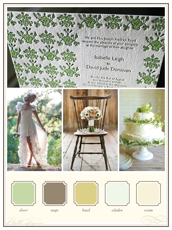 We’re probably a bit premature in our longing for spring (especially here in Syracuse), but we love a woodsy natural color palette of clover, taupe, hazel, celadon and cream to showcase our Festoon letterpress wedding invitations for a pretty spring wedding. (Photo credits: wedding invitations + wedding dress + bouquet + wedding cake.)