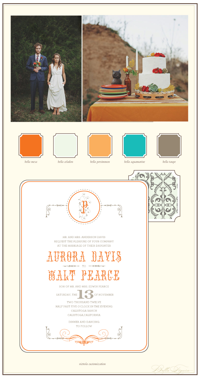Victrola customization = inks: mesa + taupe | fonts: manoir + herald | paper: white | invite size: f-8 | liner: European formal pattern in celadon and taupe ink | original design by Ben Whitla | customized by in-house designer Brenda Fox |