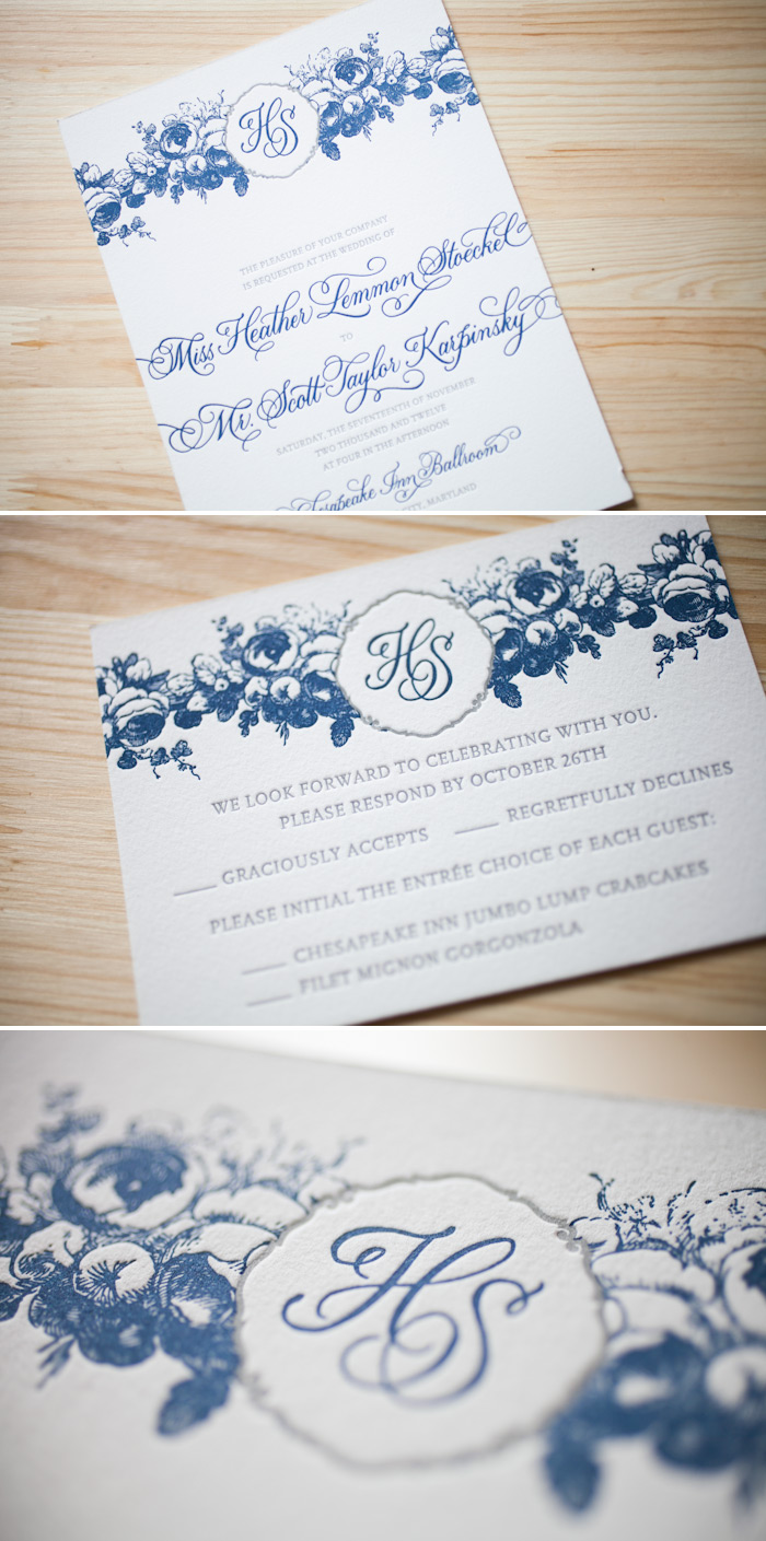 inks: navy + pewter | font: utrecht | calligraphy: victoria hand calligraphy, by Sarah Hanna | custom calligraphy monogram | paper: 1-ply white | invite size: f8 | customization #: 15685 |