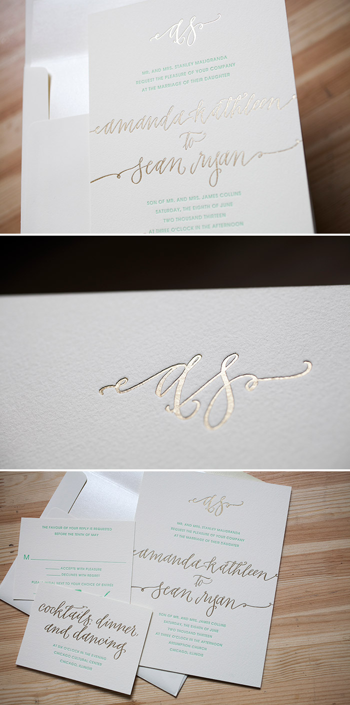 Amanda and Sean re-imagined our Madison Chic wedding invitation design in Gold Matte foil and Sea-side letterpress ink. The vertical layout and metallic envelope liner add formality to the free-flowing hand calligraphy and custom calligraphed duogram.