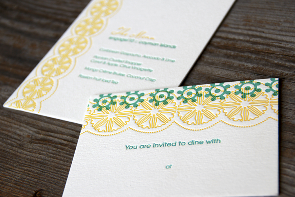 This customization of our Esperanza letterpress wedding invitation (by Lindsy Aragona) is the perfect introduction to a festive but classy event. When printing in only one or two colors, it’s great to bring in a third (or even fourth!) with edge painting and an envelope liner.