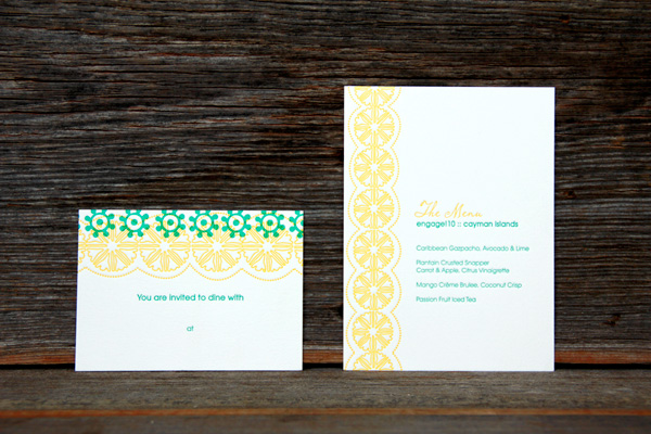 While thinking about all things spring and summer (like fresh lemonade and long walks on the beach), we started reminiscing about the super cool letterpress stationery we printed for engage!10 last year. The letterpress menus and matching escort cards feature a fun customization of our Esperanza letterpress invitations, printed in punchy aquamarine and yellow inks. Along with great summery colors inspired by the tropics, we’re now also obsessing over mango creme brulee! We’ve got to get our hands on some of that!