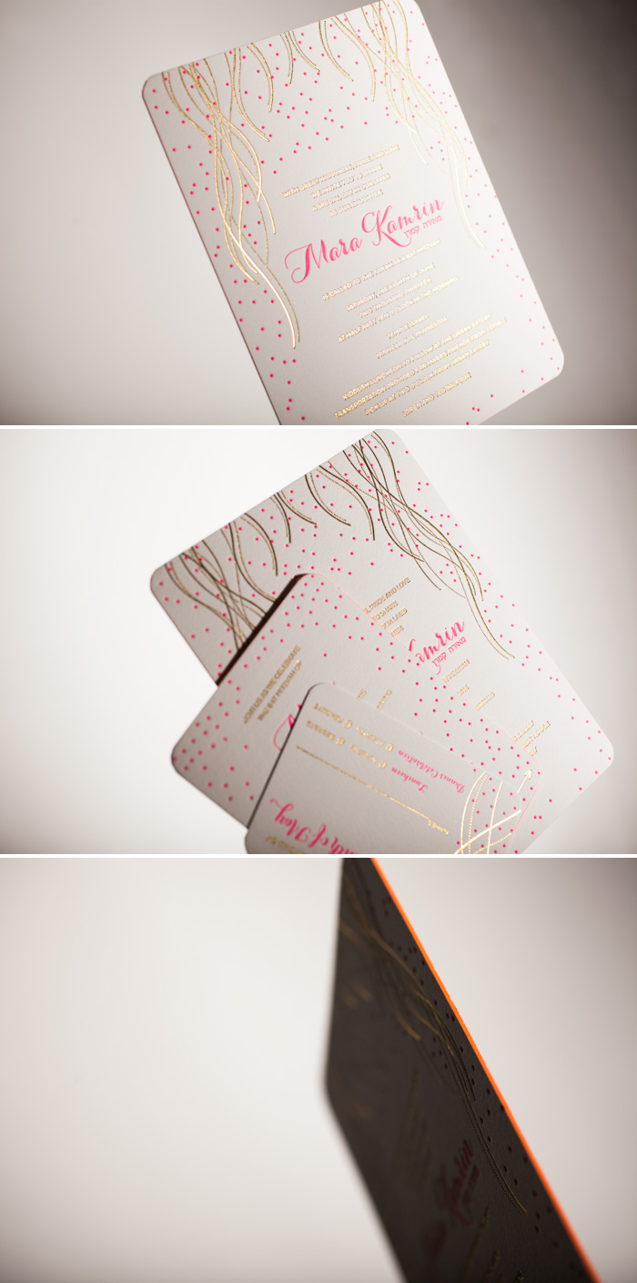 letterpress ink: hot pink | foil stamping: gold shine | paper: bella cotton 1-ply + 2-ply white | edge painting: day-glo | customization #: 17833 | Paperista