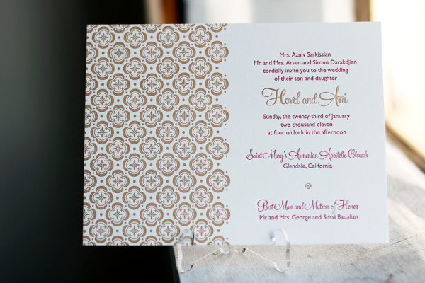 This customization of our Majorca letterpress invitations feels particularly regal printed in this sophisticated color combination of antique gold and wine. The design was adapted to a horizontal orientation and paired with pretty script for an elegant feel.