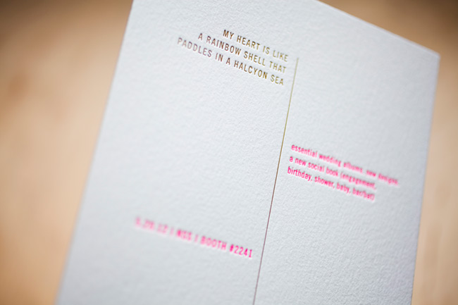 We are busy preparing for the 2012 National Stationery Show that’s just a few weeks away, but we wanted to stop and take a break to share the letterpress and foil stamped invitations that we printed and sent out for the show! Our modern Unique Minimes design set the tone, and we love the way our hot pink letterpress ink looks when paired with shiny gold foil stamping! As part of our mid-year release, we’ll be introducing a new book filled with invitation designs for life’s special occasions: engagements, birthdays, showers, Bar & Bat Mitzvah, baby, and more. 9 new invitation designs will also debut at the show, and those will be available in early July at a Bella Figura dealer near you! We have the incredibly talented calligrapher Debi Zeinert of The Blooming Quill to thank for addressing the envelopes for these invitations in a metallic gold ink. We cannot get enough of the way those envelopes look!