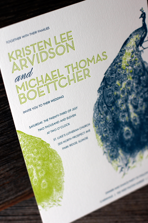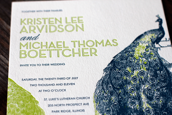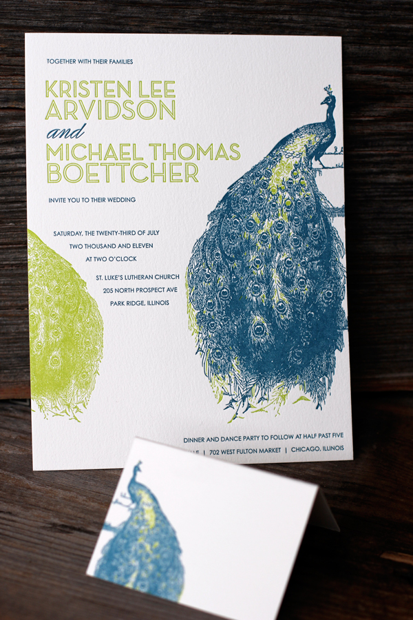 More gorgeous Mediterranean ink made an appearance with these stunning letterpress invitations in our Peacock Full design. Paired with bright spring green, this color combination is both vibrant and sophisticated. To complete the suite, pretty letterpress place cards for the reception were printed to match.