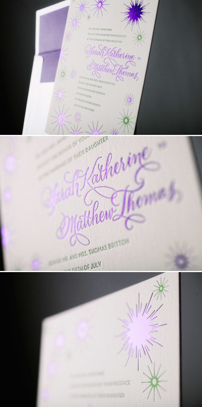 Sarah Hanna’s gorgeous hand calligraphy mimics the billowy swirls of the Illuminer design, printed in Purple Shine foil and Lavender letterpress ink for Leanne and Craig’s late summer wedding. Love this design? Order soon – this and all of Lindsy Talarico’s designs are on sale through the end of February.